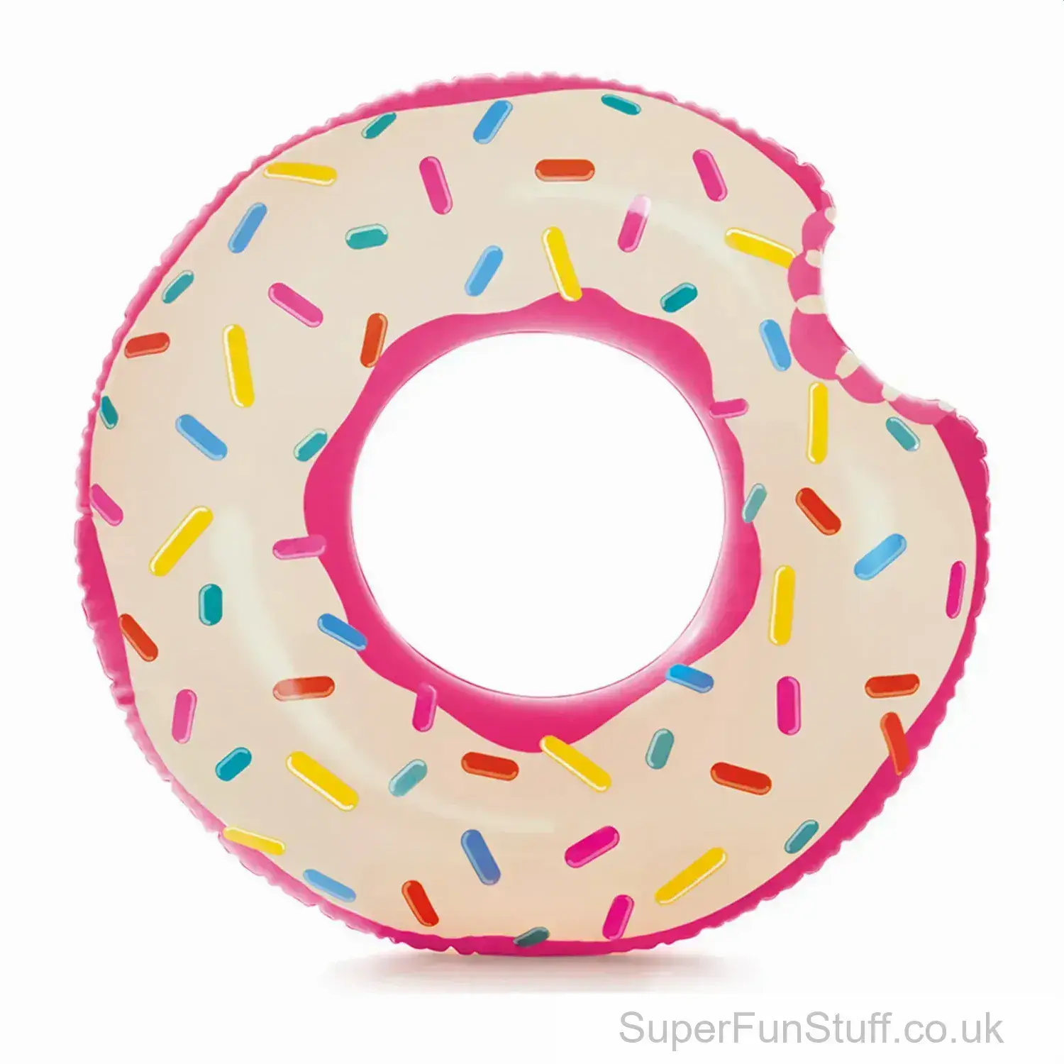 This inflatable doughnut is great fun in the pool in summer, or as a party decoration. Measuring 106cm across once inflated, the doughnut inflatable features a multicolour sprinkles design with a 'bite' taken out of the side. A fun novelty gift for children or adults and a superb pool toy.