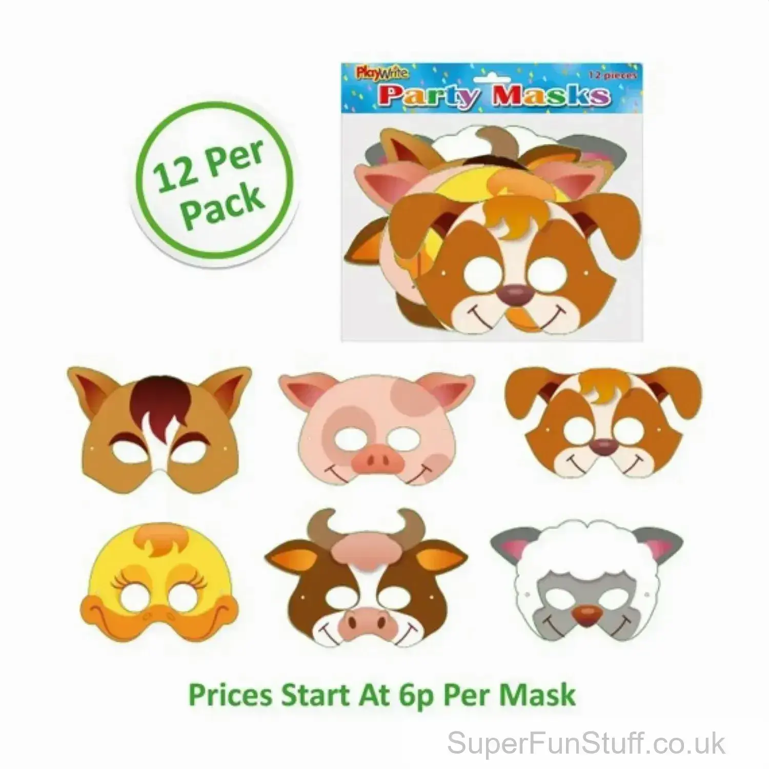 Perfect for a kid's farm animal party, this pack of 12 farm animal masks represent excellent value. Each mask comes with an elastic strap to attach around the head (one size fits all child head sizes). Supplied in the assortment of 6 different farm animals (horse, pig, dog, duck, cow and sheep) - 2 of each.